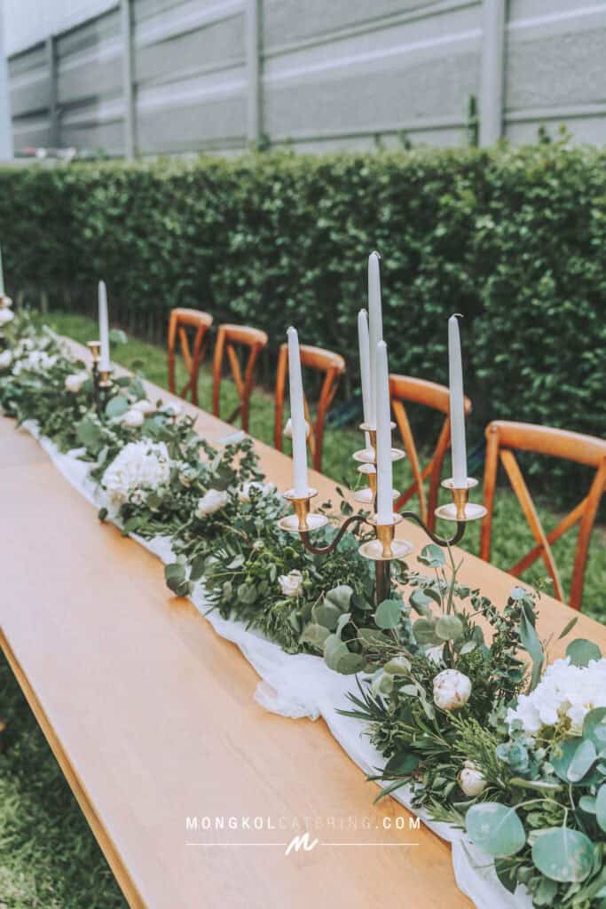 จัดเลี้ยงค็อกเทล พร้อมจัดโต๊ะ long table สวยๆ ในสวนหลังบ้าน โทนไม้ขาวเขียว