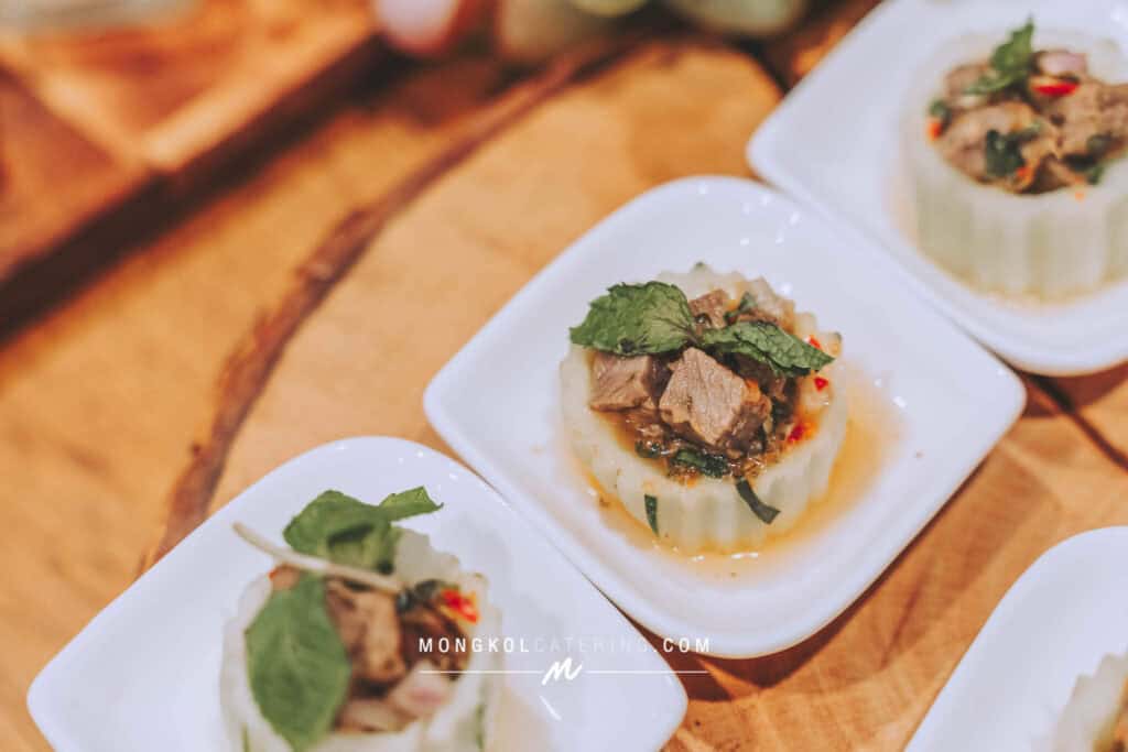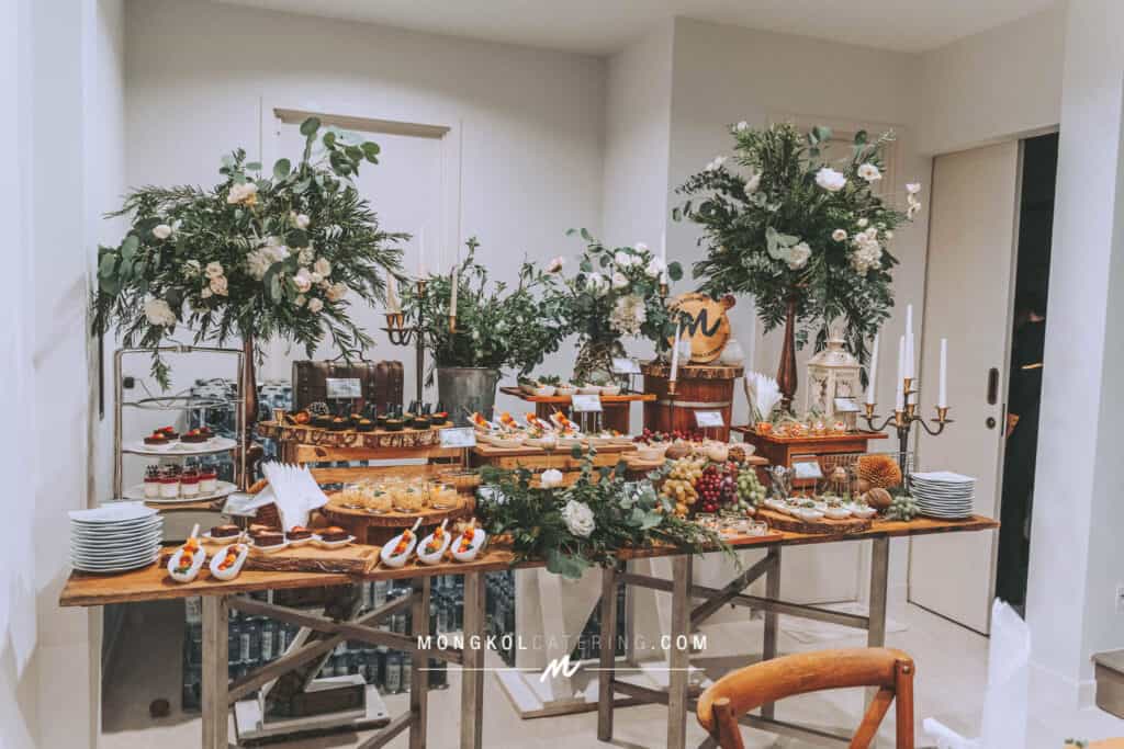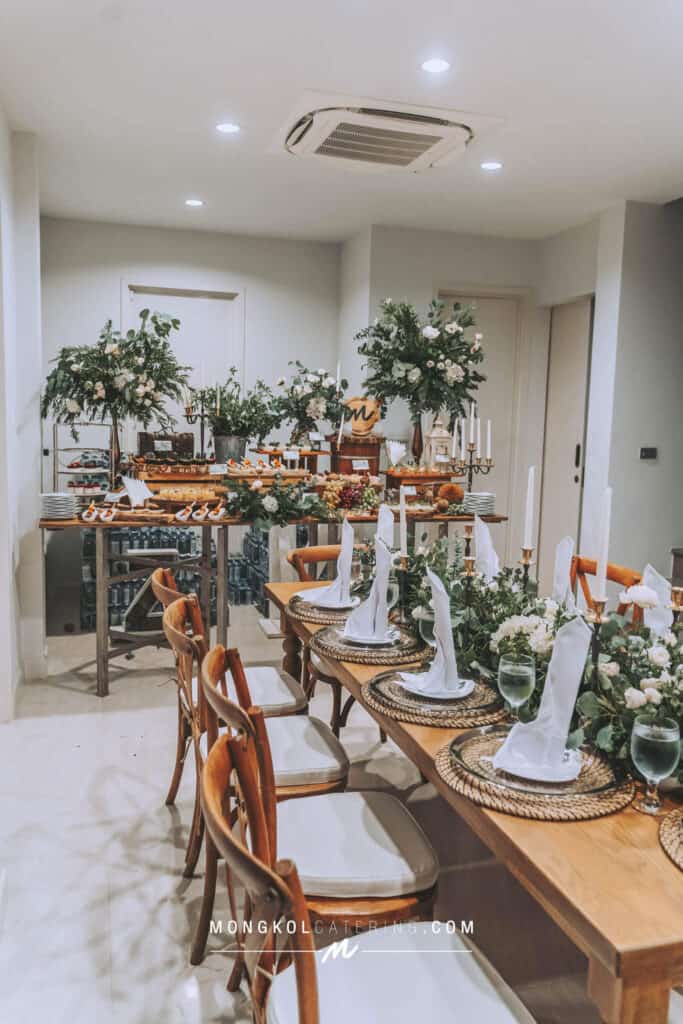 จัดเลี้ยงค็อกเทล พร้อมจัดโต๊ะ long table สวยๆ โทนไม้ขาวเขียว