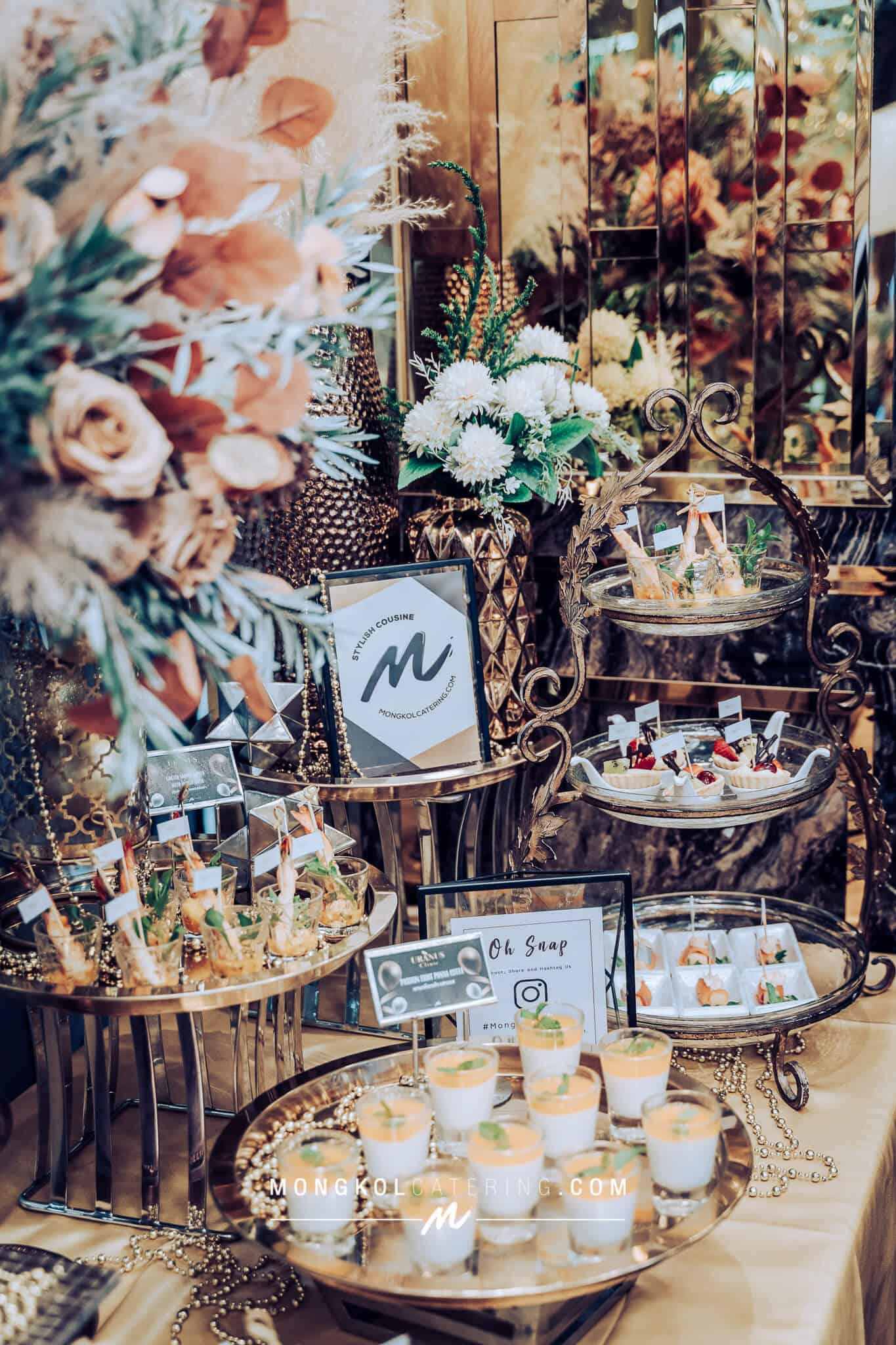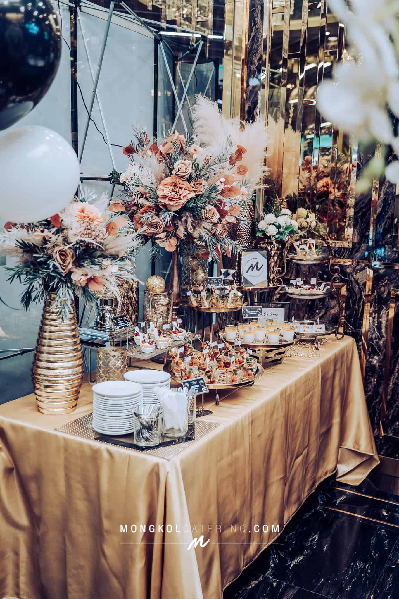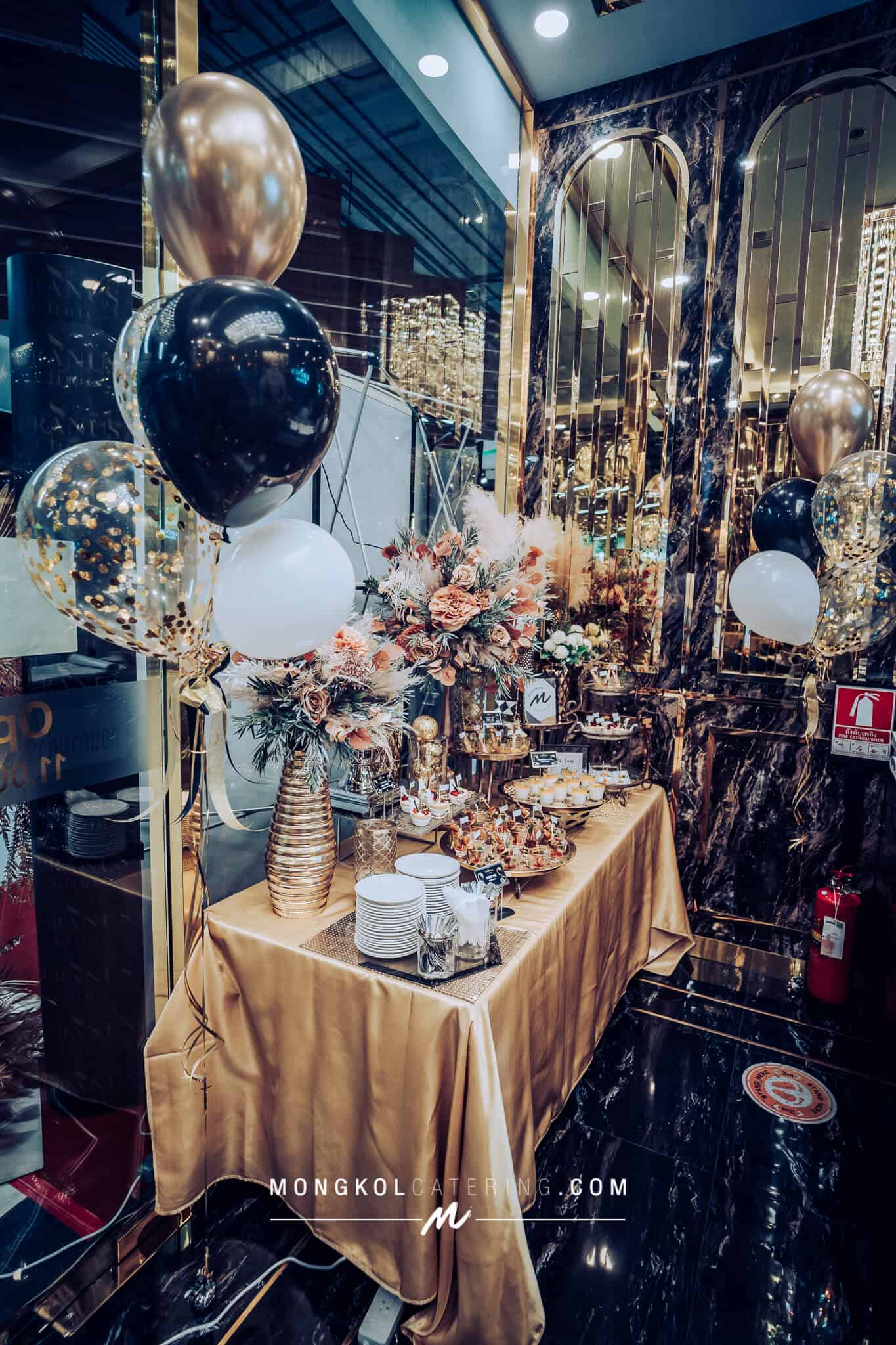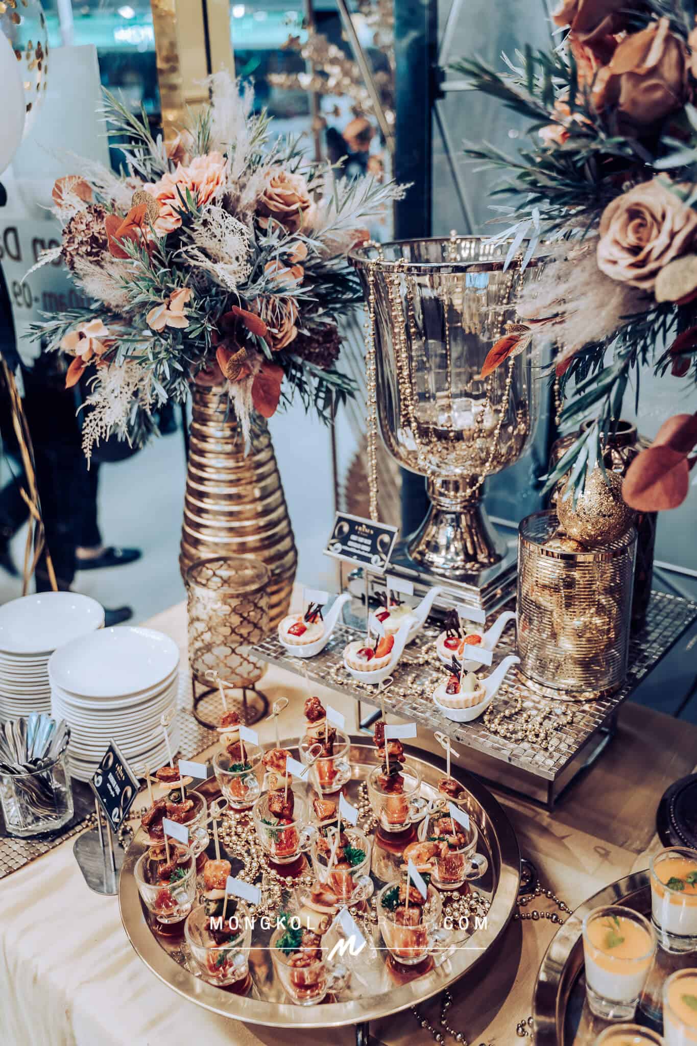 ตีมของงานโจทย์คือต้องการสีทองดูหรูหรา เหนือระดับเราจึงเนันจัดโต๊ะอาหารให้มีตีมสีทองให้มากที่สุดและเลือกอาหารเป็นค็อกเทล เพื่อให้ง่ายต่อการทานของแขกที่จะเข้ามาใช้บริการคลีนิค จัดเป็นโซนอาหารน่ารักๆ มุมนึง จะทานก็ได้ จะถ่ายรูปก็ดี อ้อแล้วพร้อมด้วยพนักงานเสิร์ฟด้วยนะคะไม่ต้องรบกวนทีมงานของทางคลีนิคเลย ดอกไม้เราก็จัดให้เข้ากับ Backdrop งานลูกค้าให้มากที่สุด