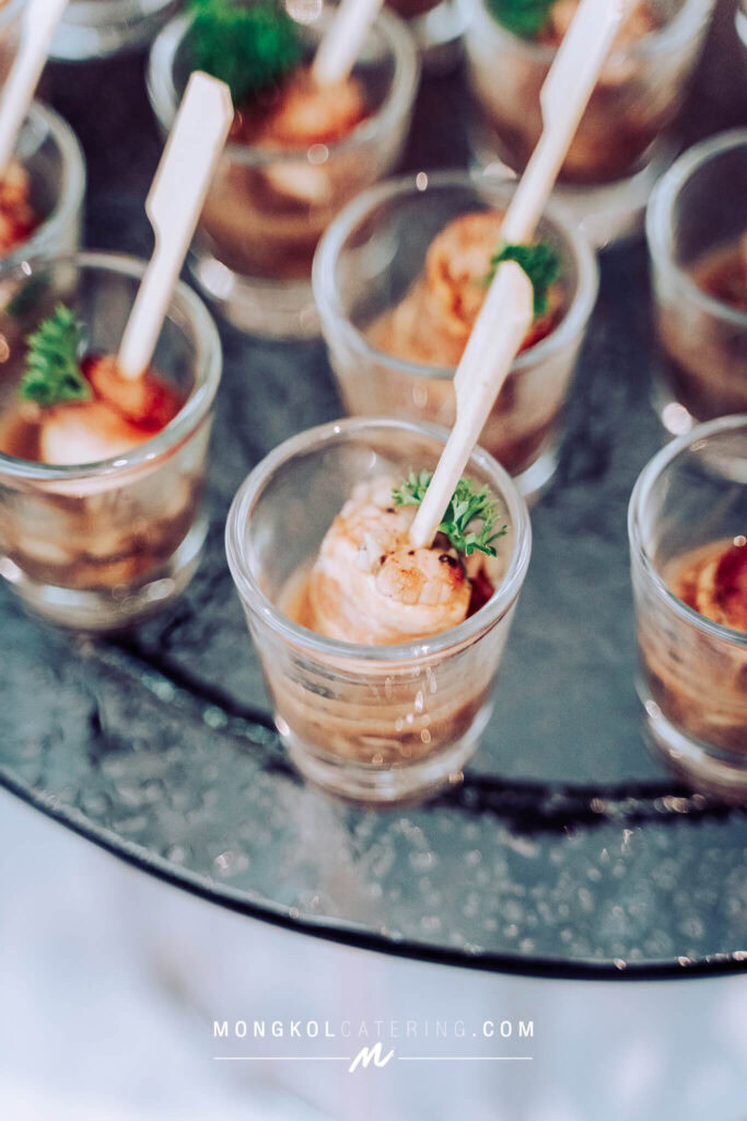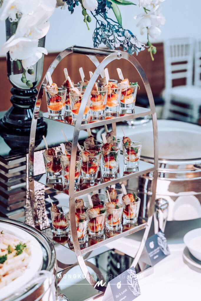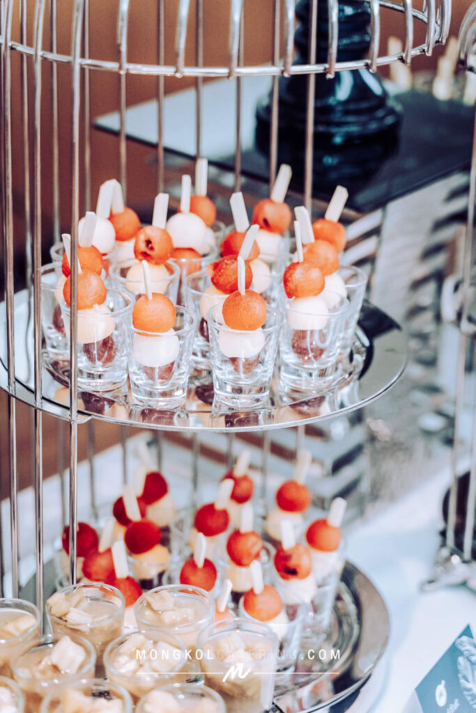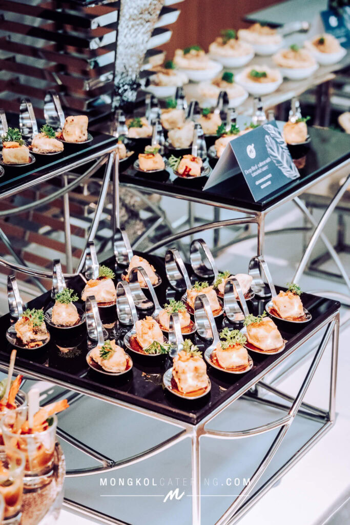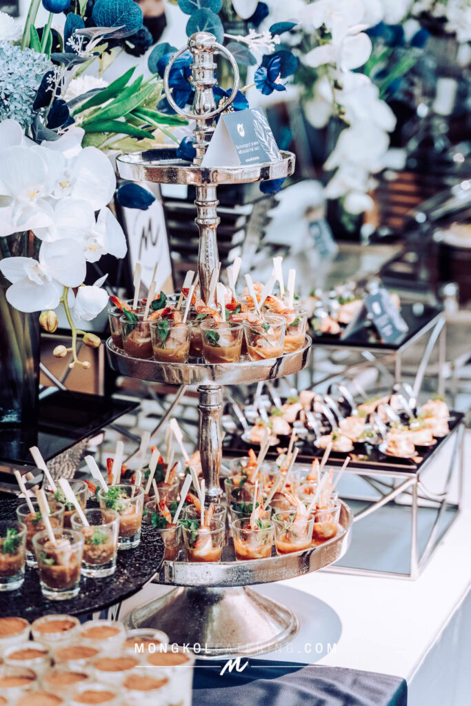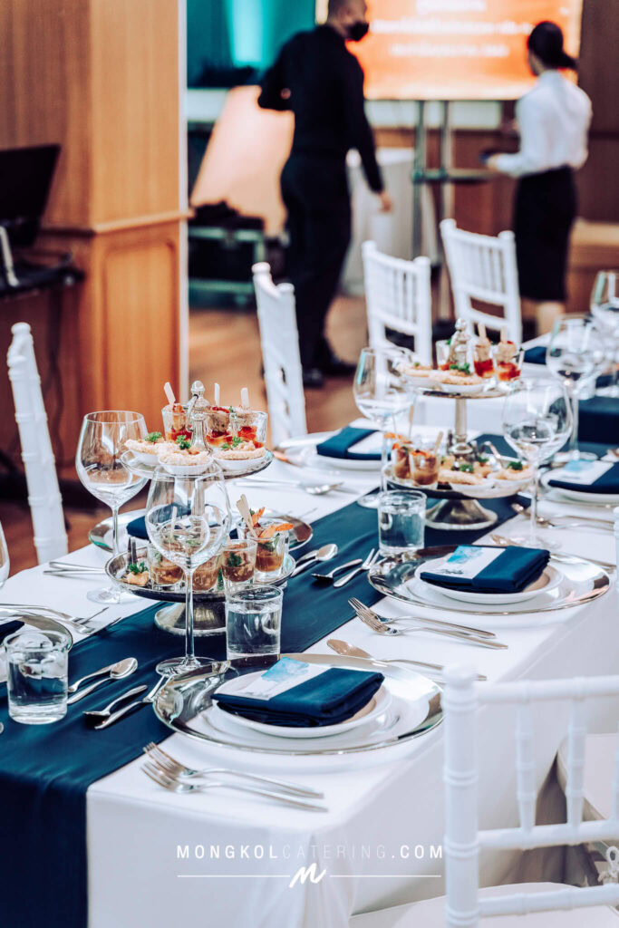 งานนี้เรา จัดโต๊ะนั่งทานแขก VIP พร้อมอาหารค็อกเทลในโทน สีน้ำเงิน Navy Blue พร้อมบริการเสิร์ฟถึงโต๊ะ