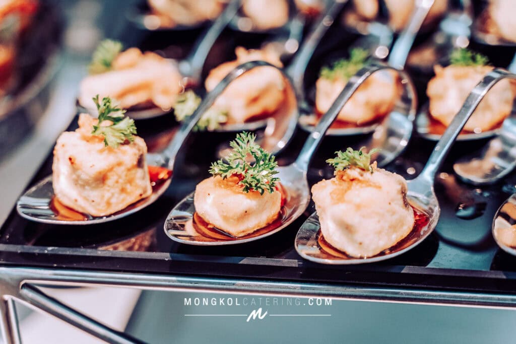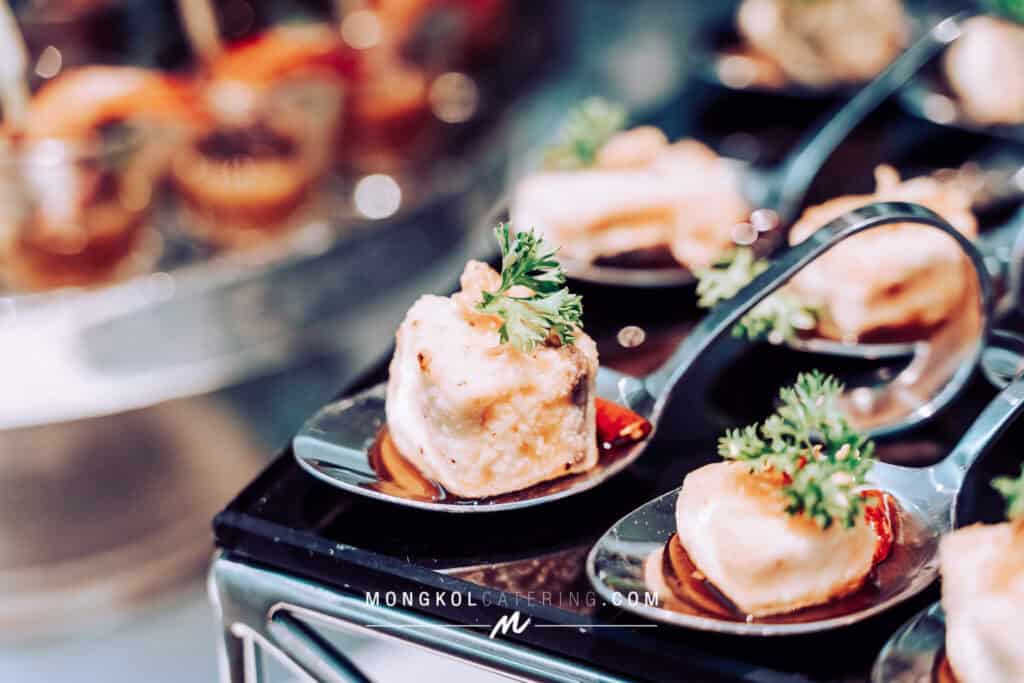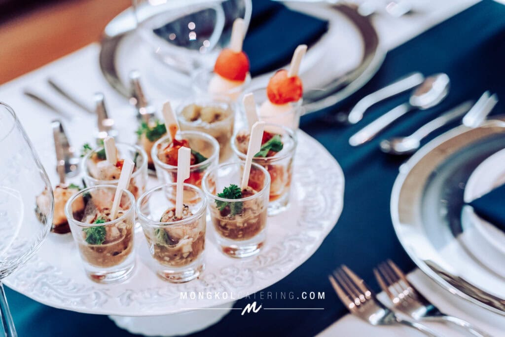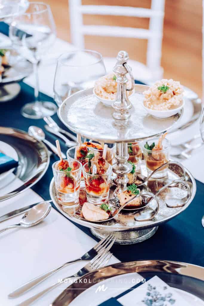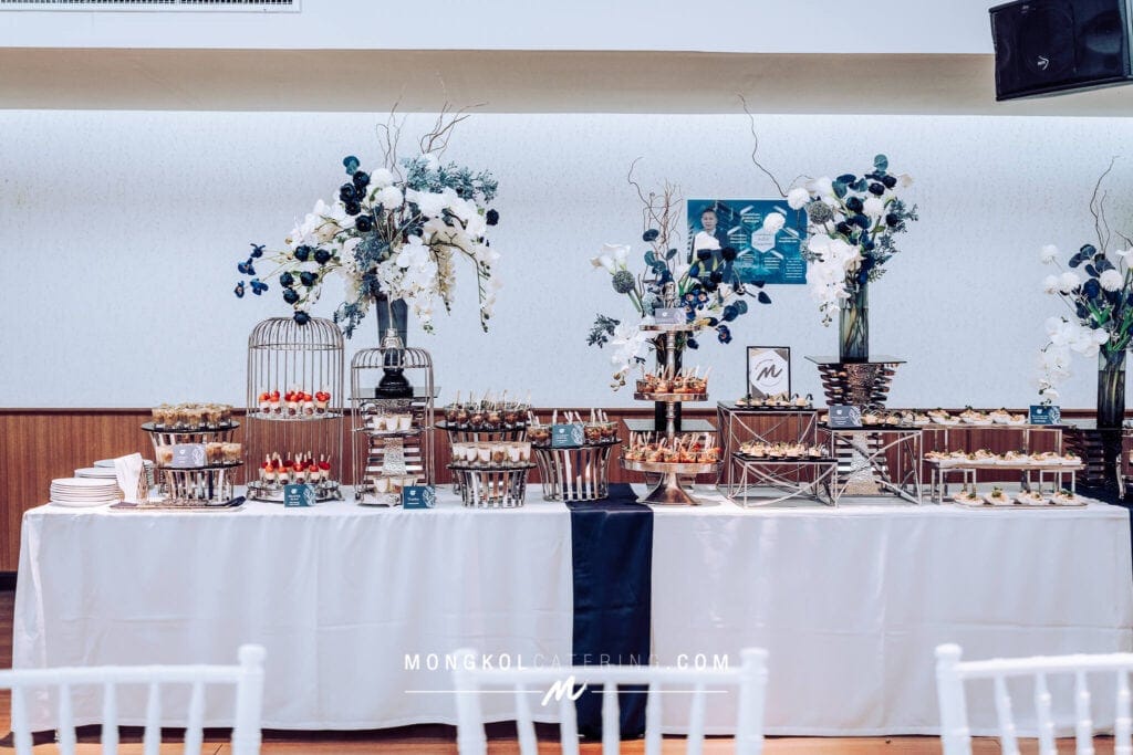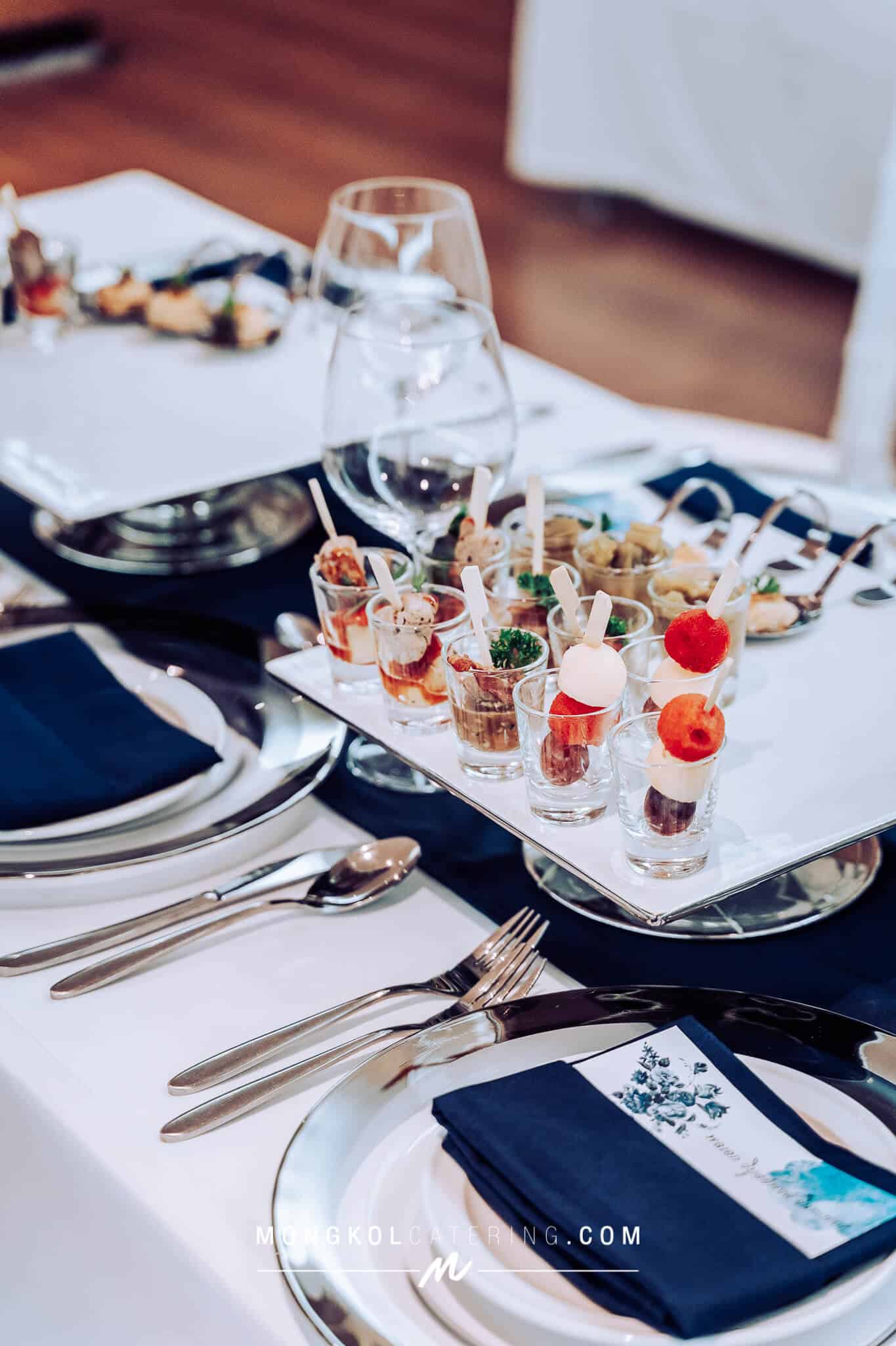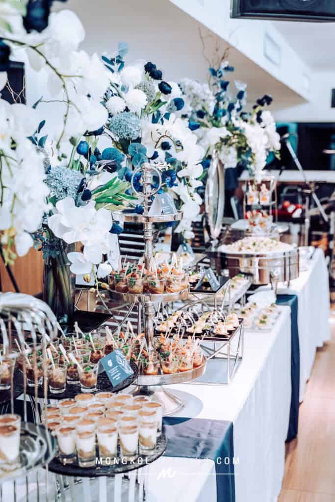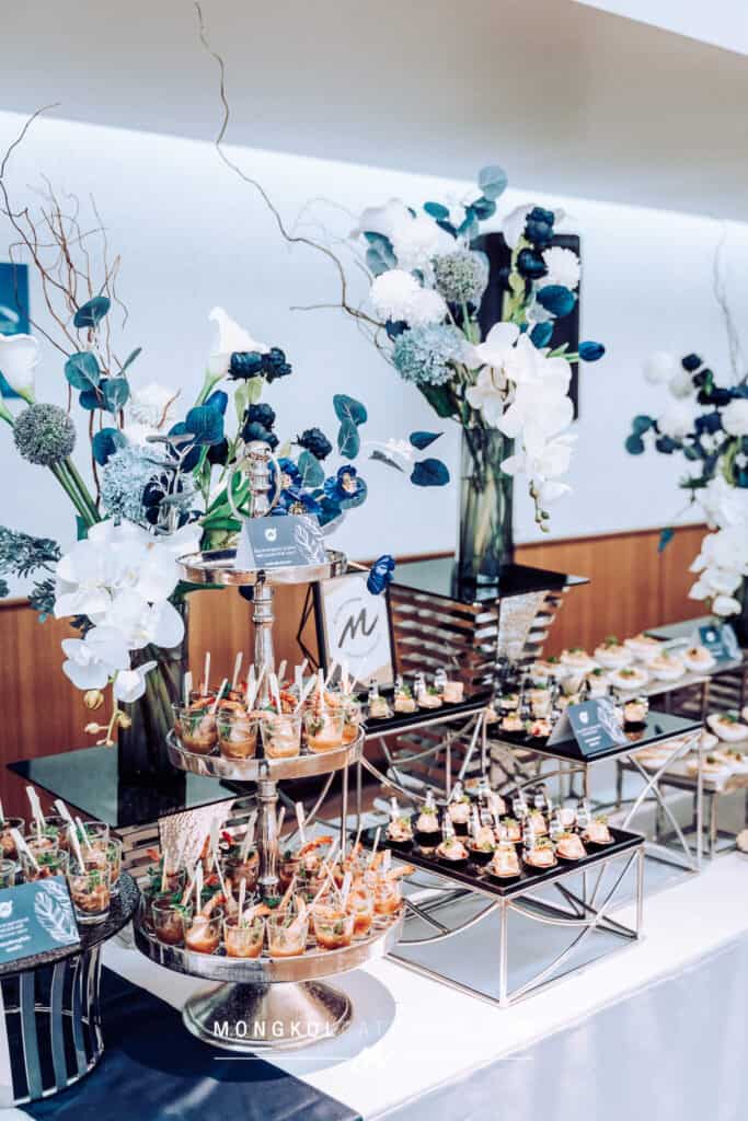 งานนี้เรา จัดโต๊ะนั่งทานแขก VIP พร้อมอาหารค็อกเทลในโทน สีน้ำเงิน Navy Blue พร้อมบริการเสิร์ฟถึงโต๊ะ