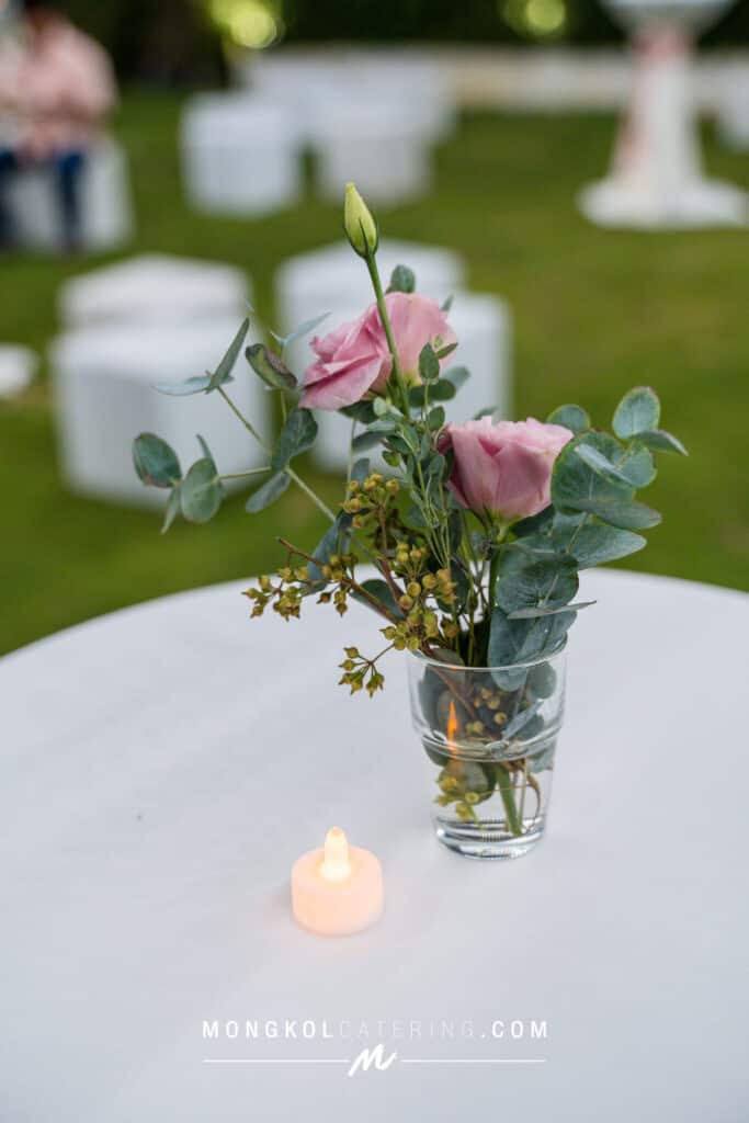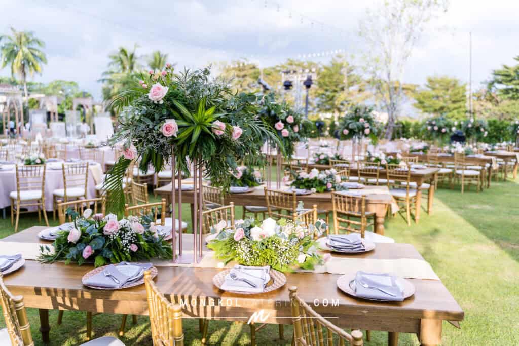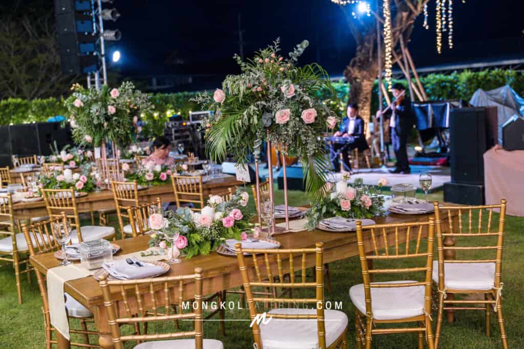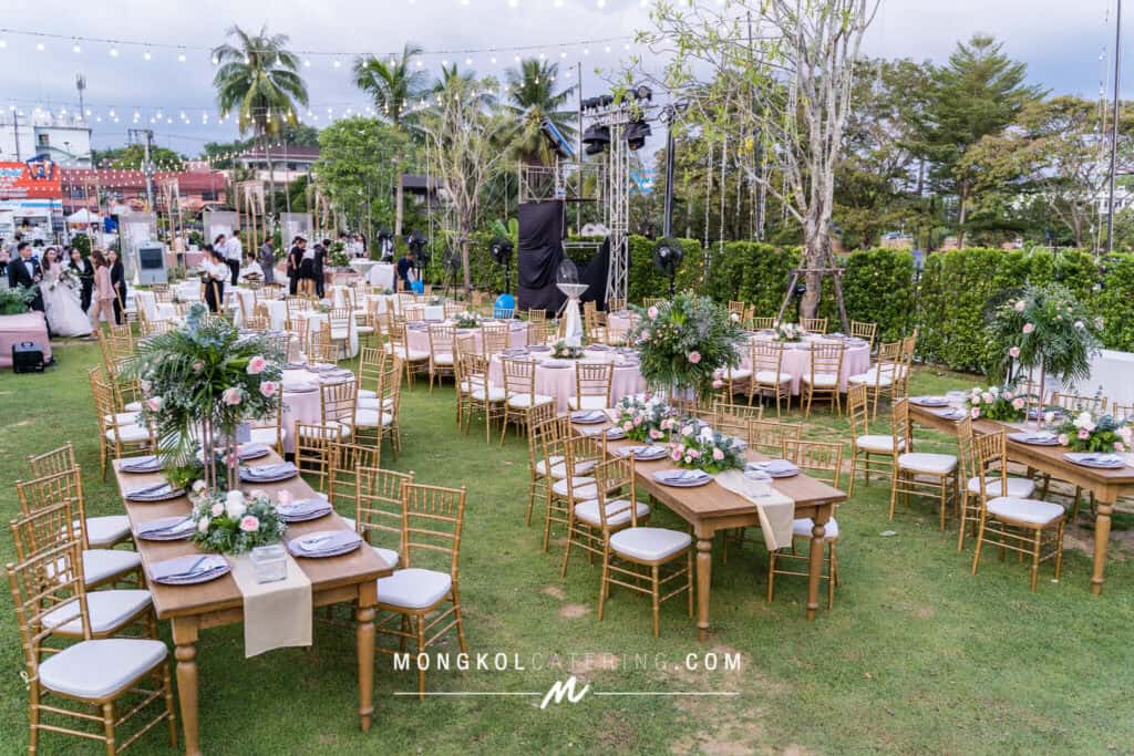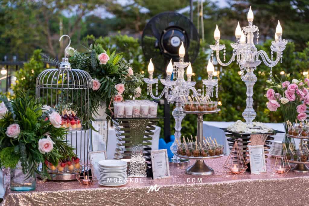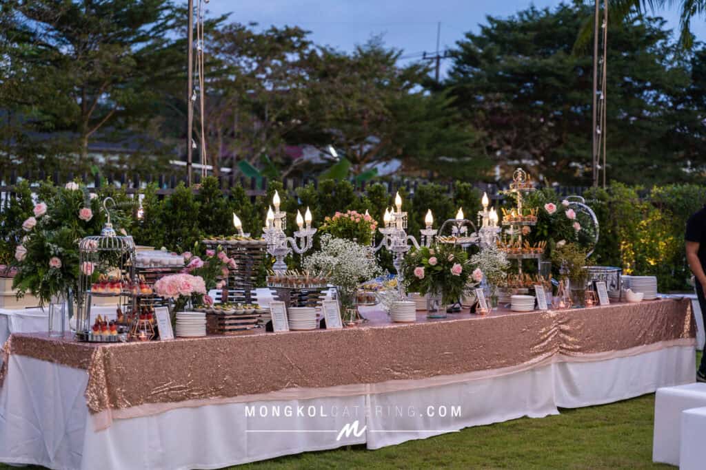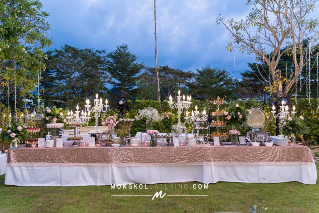 งานแต่งงาน จัดเลี้ยงค็อกเทล พร้อมจัดโต๊ะตีมชมพูไม้ @ สนามฟุตซอล จันทบุรี